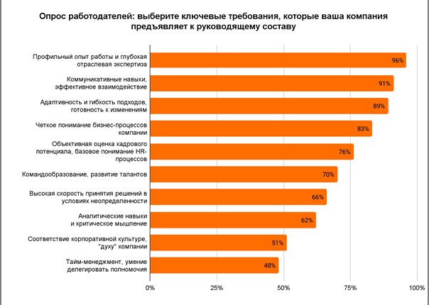 Подавляющее большинство работодателей — 96% опрошенных — считают, что в первую очередь претендент на руководящую позицию должен обладать профильным опытом и глубокой отраслевой экспертизой. В UTEAM отмечают, что это особенно важно в сфере производства и информационных технологий.