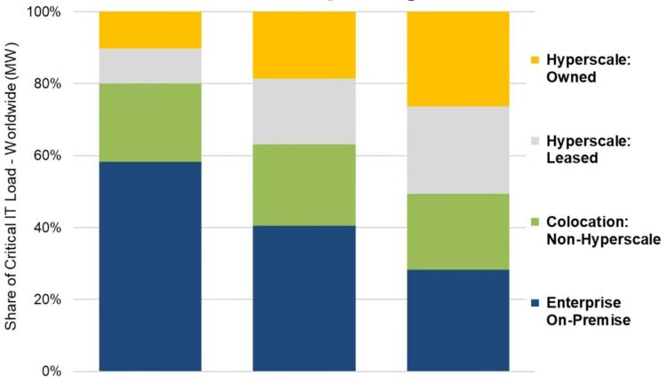 Согласно оценке Synergy Research Group, в 2022 г. общее число ЦОДов, принадлежащих гиперскейлерам — провайдерам облачных услуг глобального уровня вроде AWS или Alibaba Cloud, — а также арендуемых ими, вплотную приблизилось к 900. Это примерно 37% от общего числа дата-центров в мире; ещё около 23% приходится на коммерческие ЦОДы, предоставляющие свои площади для колокации клиентского оборудования. В итоге на долю частных центров обработки данных (on-premises) остаётся 40% — совсем немного, если сравнивать с почти 60%, которых эта доля достигала ещё в 2017 г.