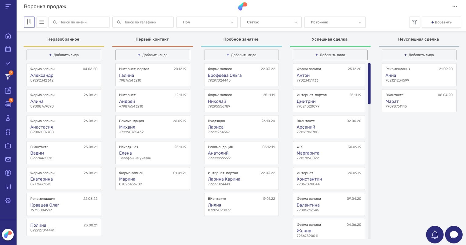 Предварительная запись на пробное занятие, воронка продаж в виде канбан-доски, автоматический сбор лидов с указанием источника, отчеты по менеджерам по продажам помогут сотрудникам центра не упустить ни одной заявки и вовремя напомнить о себе потенциальным клиентам.