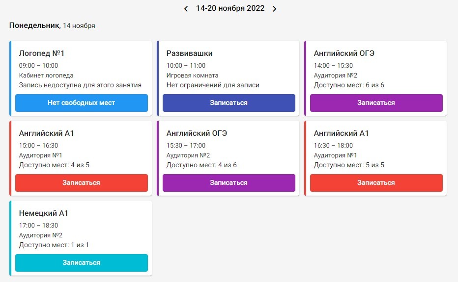 Разместите ссылку с расписанием на сайте или в соц.сетях. Далее клиент выбирает нужное занятие, доступное время и оставляет контактные данные. Без участия администратора. Расписание ведется онлайн, что позволяет избежать конфликтов записи клиентов и занятий.