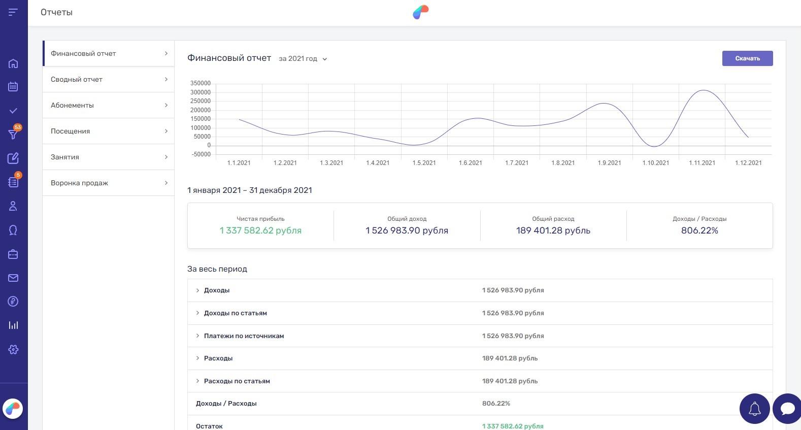 Отчеты в CRM Параплан: финансовый, по абонементам, посещениям, занятиям