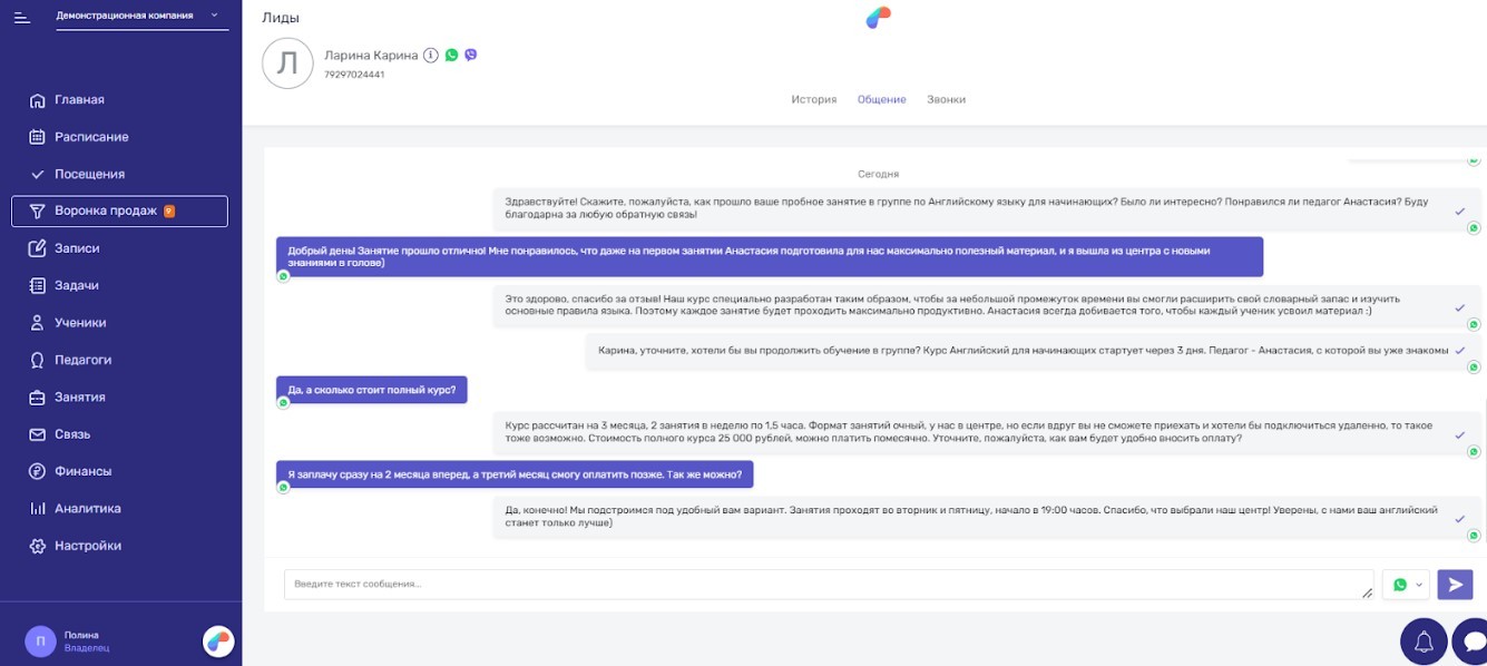 Использование CRM-системы помогает повысить конкурентоспособность бизнеса, обеспечить лояльность клиентов, а также оставаться на связи 24/7 благодаря интеграции с мессенджерами.