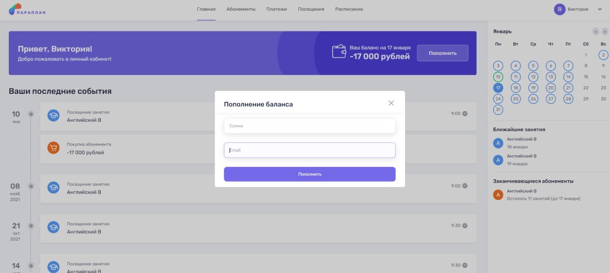 Онлайн оплата через Личный кабинет ученика в Параплан CRM.
