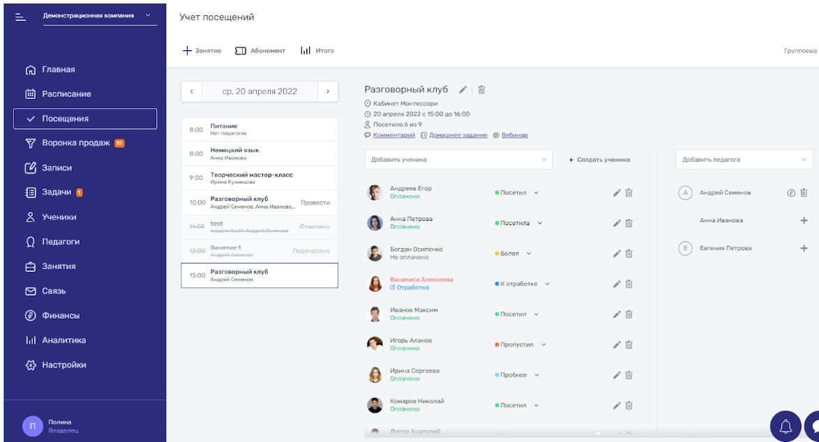 Как видно на скриншоте ниже, в специализированной CRM-системе есть отдельный раздел “Посещения” для работы с занятиями.