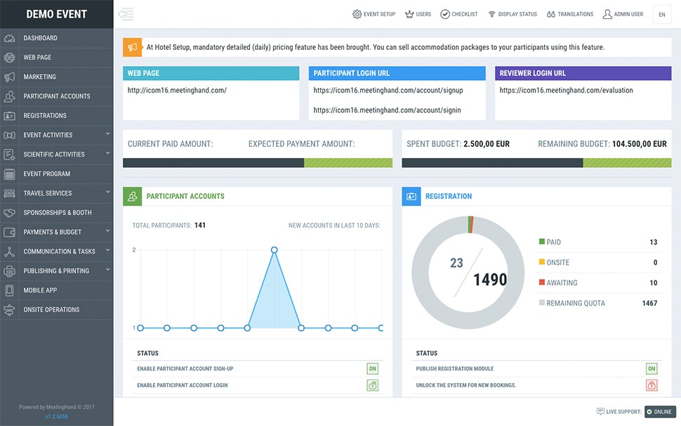 MeetingHand — это онлайн-платформа для управления мероприятиями, которая помогает менеджерам планировать, организовывать и продвигать свои проекты. Некоторые из ее функций включают управление регистрацией мероприятий, маркетинг, создание веб-сайта управление посетителями и продажа билетов.