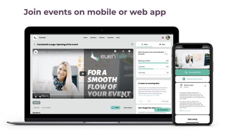 Функция сетевого взаимодействия в программе позволяет участникам связываться и организовывать виртуальные встречи друг с другом. Eventee предлагает мобильные приложения для устройств на базе iOS и Android.