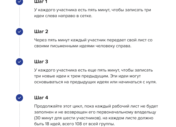 Через пять минут каждый участник виртуально передает свои идеи, щелкая вкладку справа. Затем у них есть пять минут, чтобы добавить к идеям следующего участника, и процесс продолжается до тех пор, пока все вкладки не будут заполнены. После сеанса брейнрайтинга модератор собирает все идеи, удаляет дубликаты и разбирает их с командой во время видеозвонка.