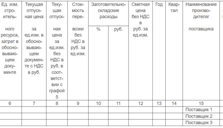 Там же в Приложении 1 можно увидеть форму для оформления конъюнктурного анализа. Рекомендуемый образец включает 20 граф по каждой позиции и выглядит так: