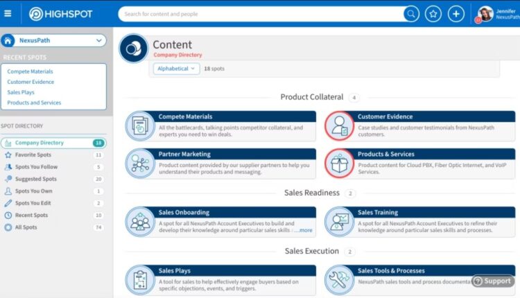 Продавцы могут использовать Highspot для публикации контента в Интернете и создания презентаций, содержащих видео, изображения и отчеты для покупателей. Программное обеспечение позволяет контролировать публикуемый контент и ограничивать доступ для избранной аудитории.