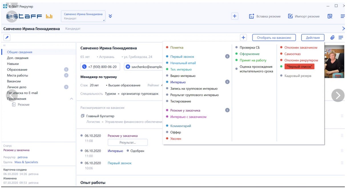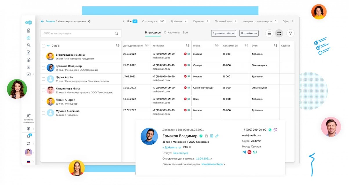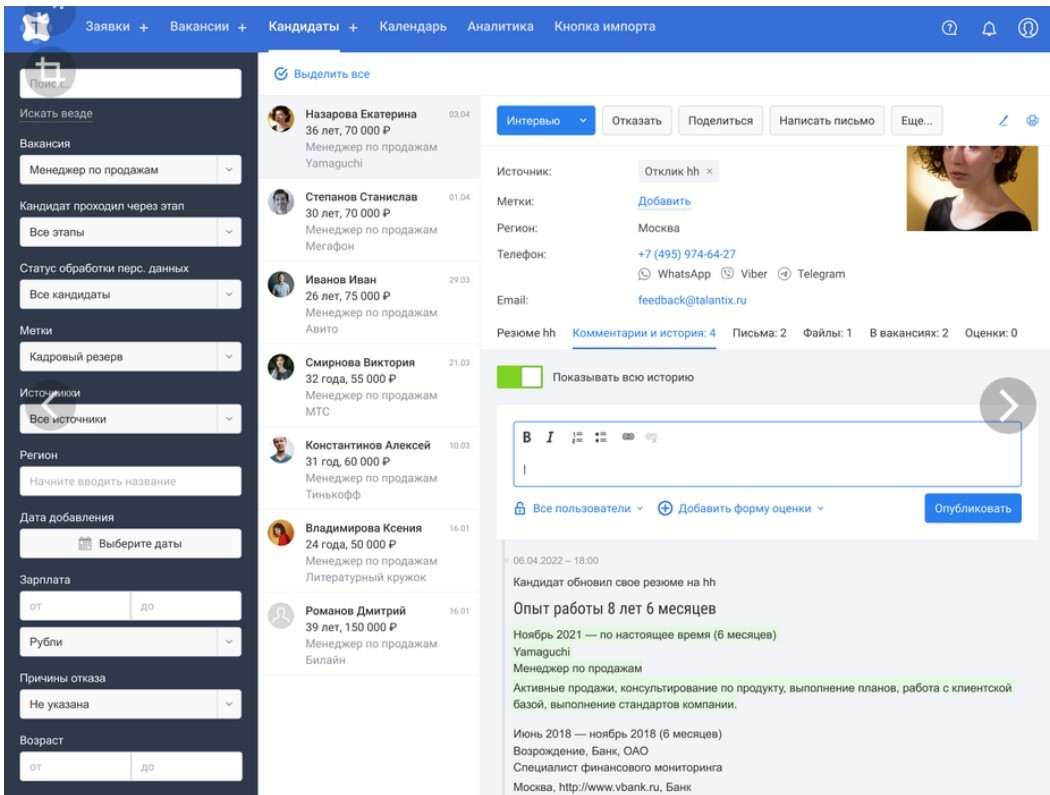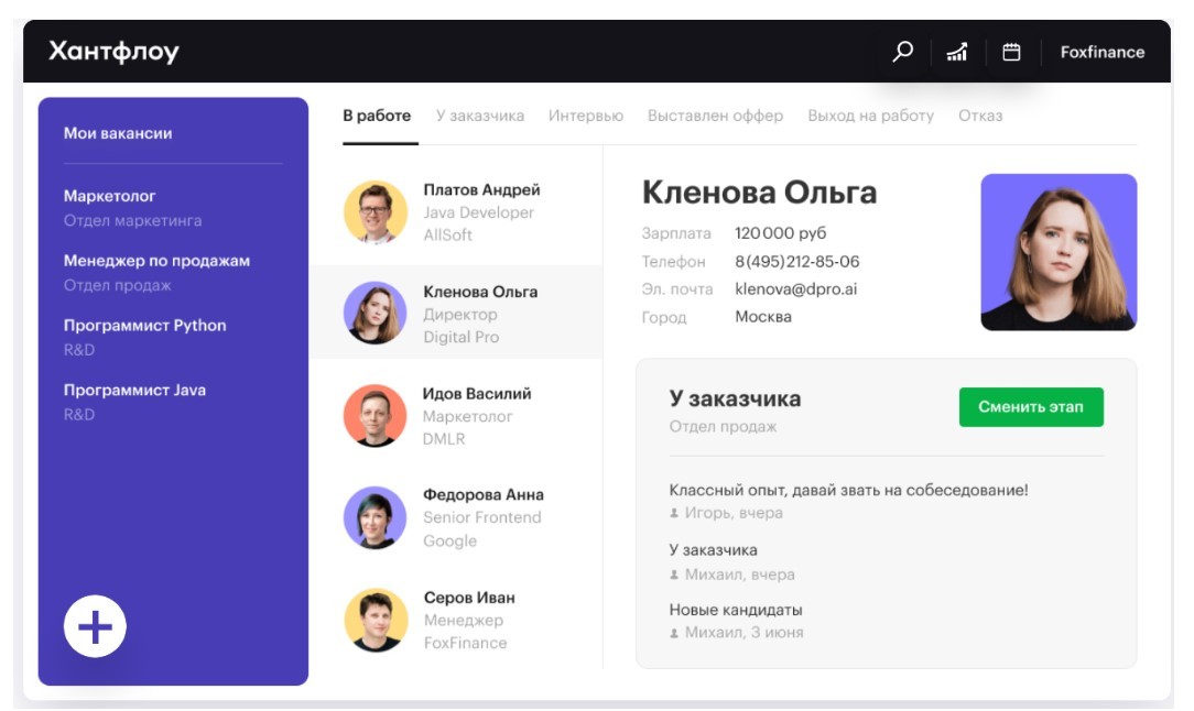 Интерфейс запатентован. Все основные действия на одном экране, одним кликом можно перевести кандидата на новый этап и продолжать с ним работать.