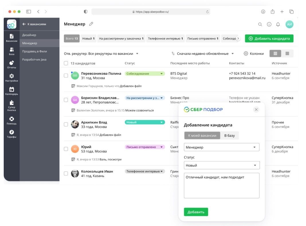 • Переписка с кандидатами ведется из СберПодбора через почтовый сервис, в WhatsApp или Telegram, есть шаблоны сообщений. Вся история общения сохраняется. Массовая рассылка только планируется к разработке.