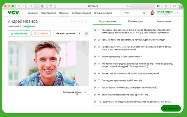 Skillaz — интеллектуальная рекрутинговая система полного цикла, которая автоматизирует все этапы рекрутинговой воронки, роботизированно оценивает претендентов и приглашает их на собеседования. В программе можно удобно вести профиль кандидата, и что самое важное — проводить видеоинтервью. В этом приложении есть возможность предоставить кандидату анкету для заполнения. Также есть возможность проводить тестирования. О видах и способах проведения тестирования мы говорили выше.