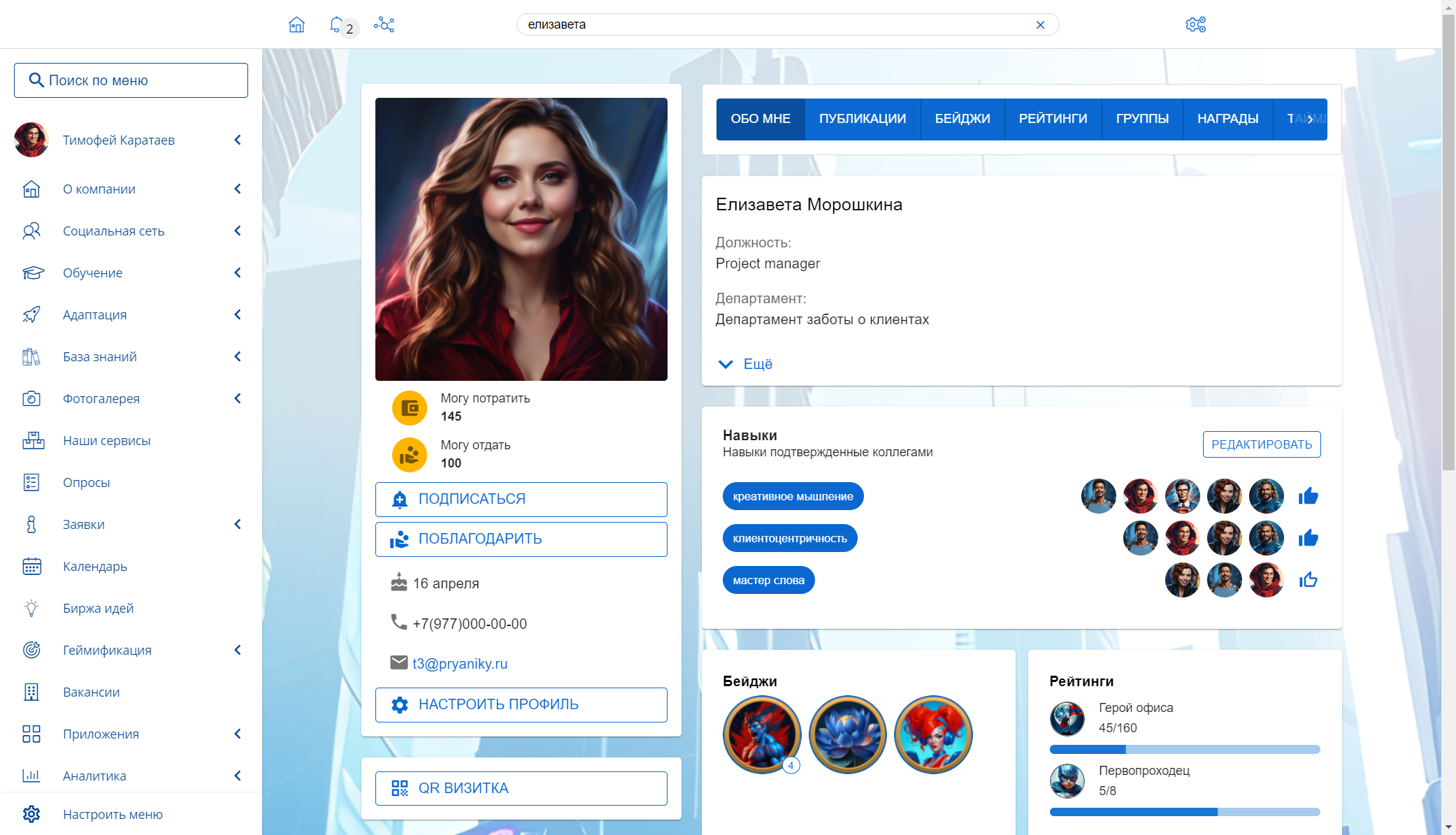 Полноценные профили сотрудников. В КСС есть единый центр информации о сотрудниках, который можно синхронизировать с различными источниками: 1С, AD, FreeIPA и другими. В профиле можно посмотреть самые разные личные данные: от должности и информации о прошедших обучениях до сделанных публикаций, списка наград в геймифицированных программах и навыков, подтвержденных коллегами.