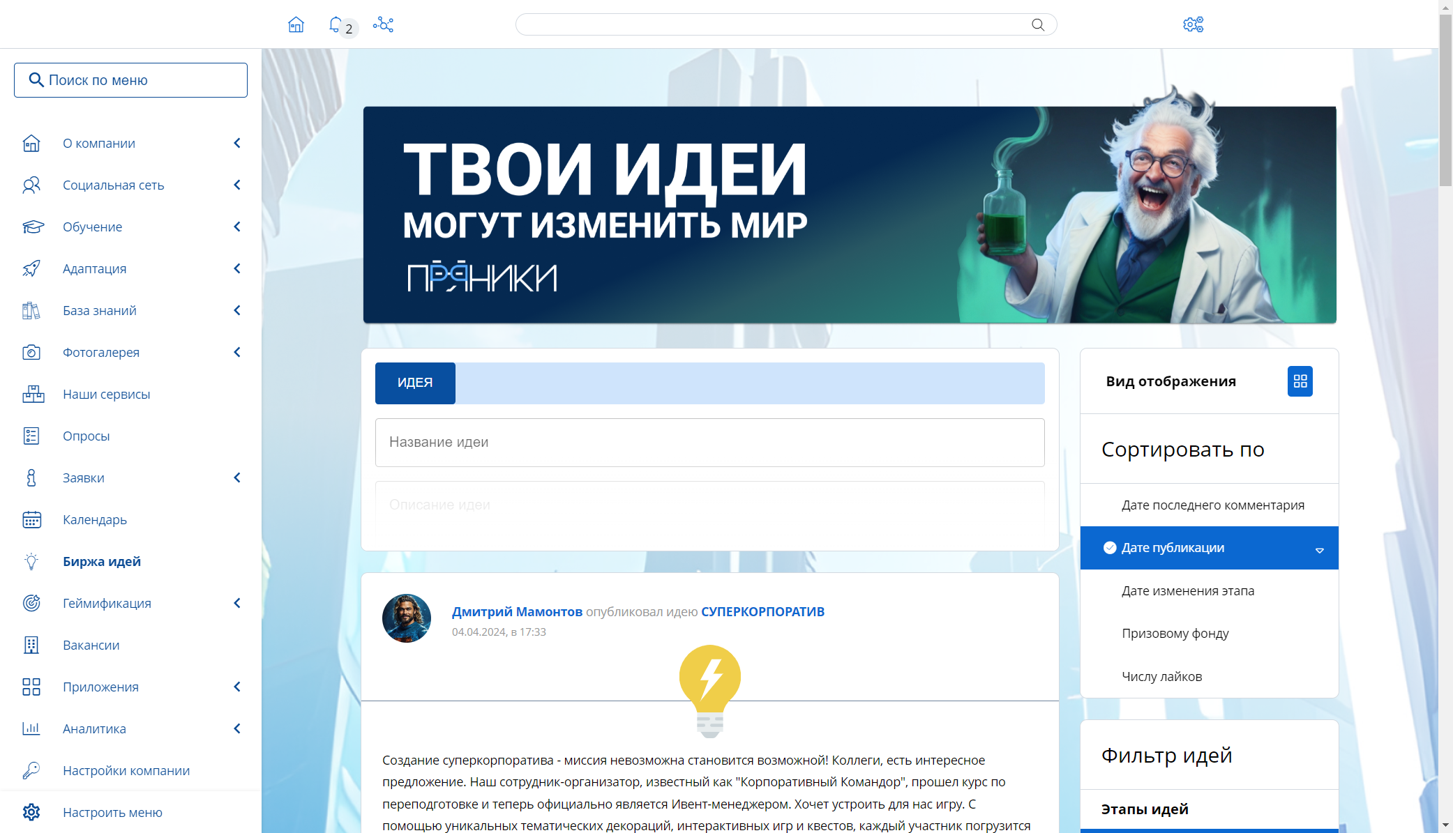Кто знает о компании больше, чем ее сотрудники? Именно поэтому они способны предложить действительно полезные решения по усовершенствованию бизнес-процессов, сокращению издержек и не только. Благодаря бирже идей любой сотрудник получает возможность быстро поделиться своими мыслями, не сомневаясь, что они действительно важны для компании. Чтобы реализовать потенциал сотрудников и простимулировать их делиться своими идеями, в корпоративной платформе используется сразу несколько решений.
