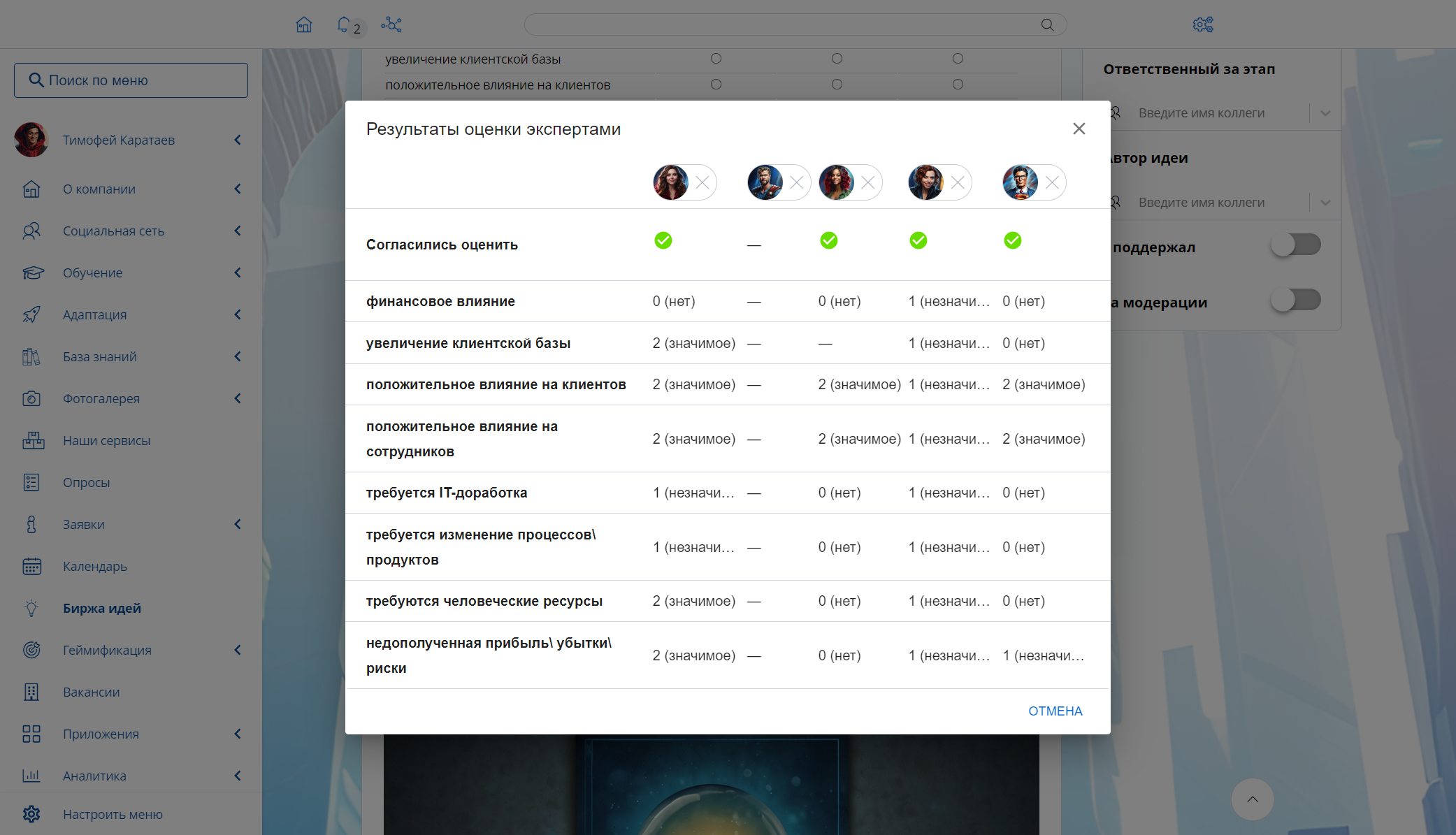 Анкета оценки. Назначенные эксперты могут оценивать идеи в свободном формате или по готовым анкетам, чтобы в результате каждое выдвинутое предложение получало оценку в баллах.