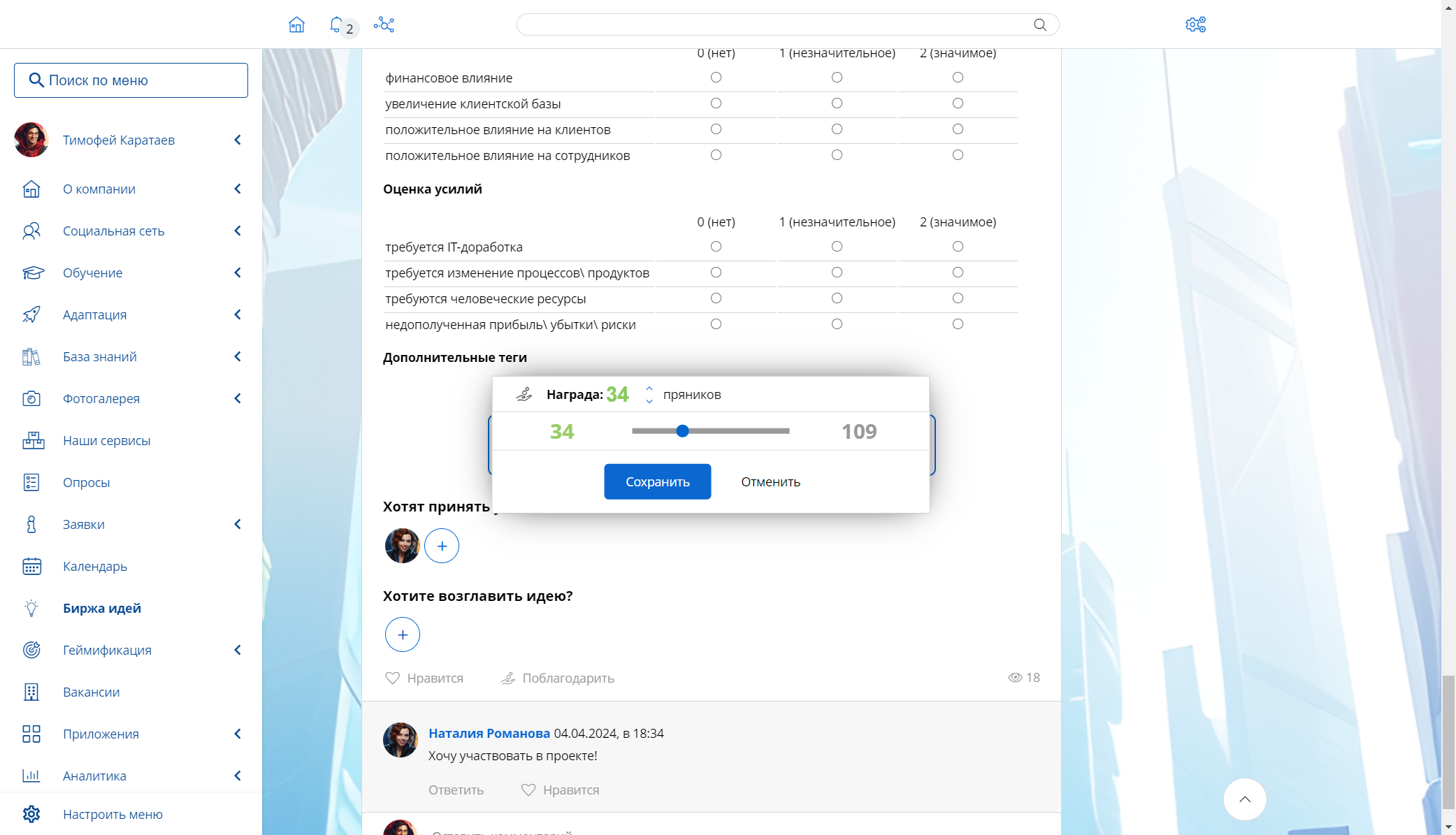 Личная мотивация. Для большей вовлеченности сотрудников можно подключить возможность инвестировать в идеи виртуальную корпоративную валюту. Чтобы повысить интерес, лидеры продвижения идеи и все «инвесторы» после успешной реализации проекта получат награды и «дивиденды» в формате виртуальной валюты и корпоративных бейджей.