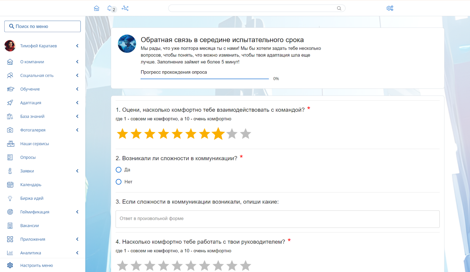На корпоративном портале можно создавать опросы разной сложности, в том числе с ветвлением. Опросы в «Пряниках» по формату напоминают привычные всем «Google Формы» и «Microsoft Forms», но у них есть несколько собственных фишек, которые оценят HR-специалисты. Например, очередность вопросов можно настраивать в зависимости от того, какой именно ответ на предыдущий вопрос дал респондент (опция ветвления). Также можно использовать вариант ответа «Другое» с возможностью оставить развернутый комментарий, объединять группу вопросов на одной странице, пользоваться планировщиком опросов с тайм-лайном и т. д.