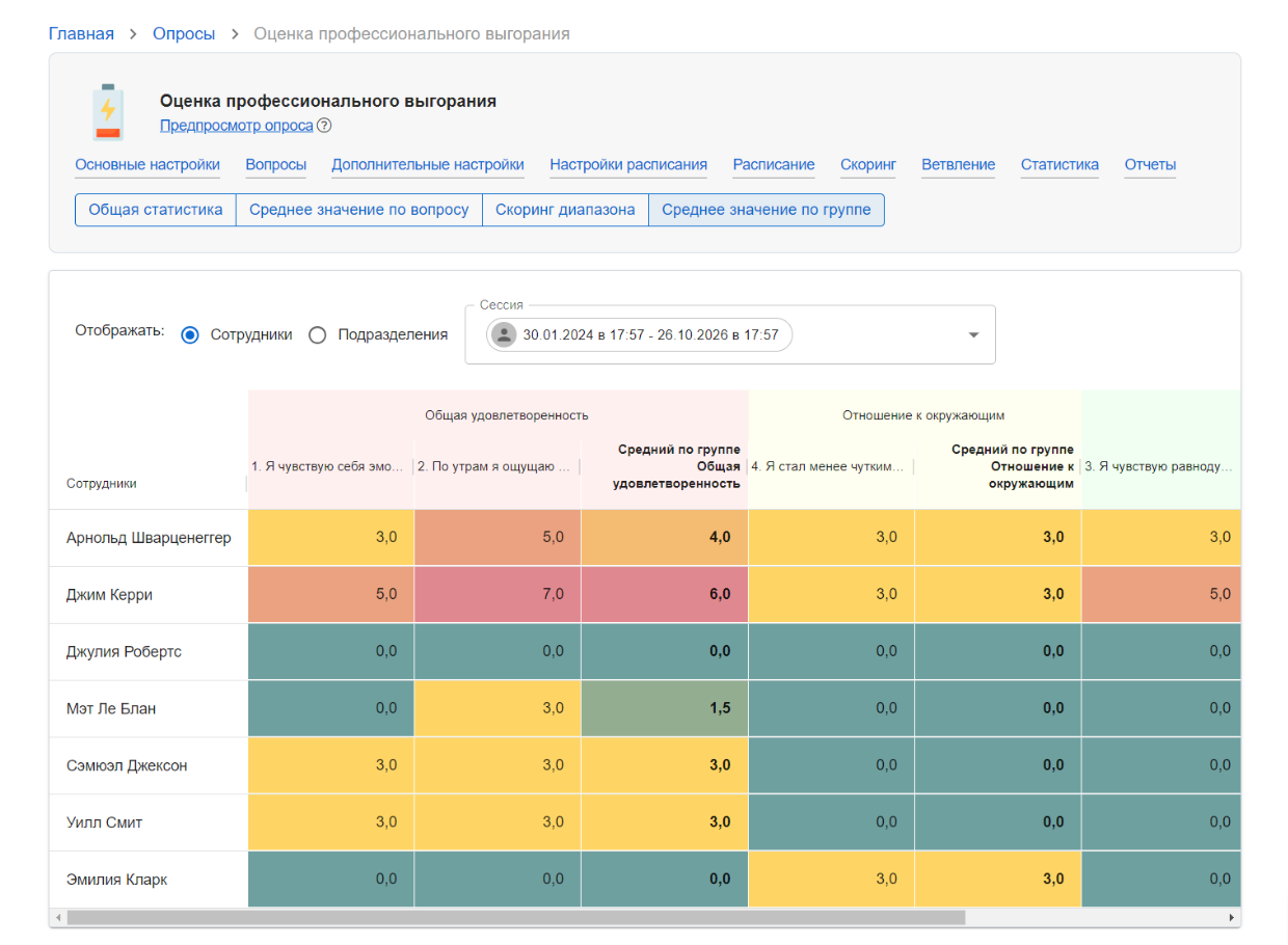 В «Пряниках» есть не только привычная статистика ответов сотрудников, но и скоринг. Составитель опроса может назначить вариантам ответов числовые значения и задать определенные правила подсчета результатов. После получения всех ответов, система составит наглядный статистический срез – по нему можно сравнить сотрудников друг с другом, используя конкретный критерий. Для удобства используются цветовые индикаторы – они «подсвечивают минимальные и максимальные значения.