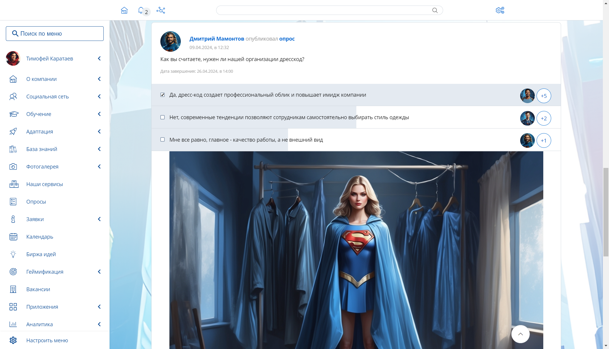 Помимо комплексных сложных опросников, статистика по которым доступна только администратору и назначенным модераторам, на портале есть легкий инструмент для запуска опросов-голосований. Их могут создавать все сотрудники, что делает общение в корпоративной соцсети более живым и динамичным. Например, любой пользователь может запустить голосование «Когда пойдем на шашлыки?» или «В каком цвете лучше оформить кухню?».