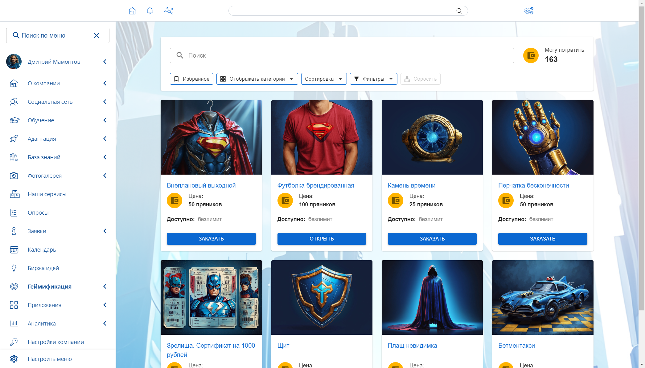 Виртуальная валюта. Способ поощрить сотрудника объективно (за участие в конкурсе, проведение мастер-класса и т. д.) или субъективно (сотрудники могут «дарить» валюту друг другу). Заработанное можно потратить во внутреннем магазине привилегий: на подарочный сертификат, мерч, гаджеты или нематериальные «суперсилы» (например, проспать на работу или уйти в пятницу пораньше).