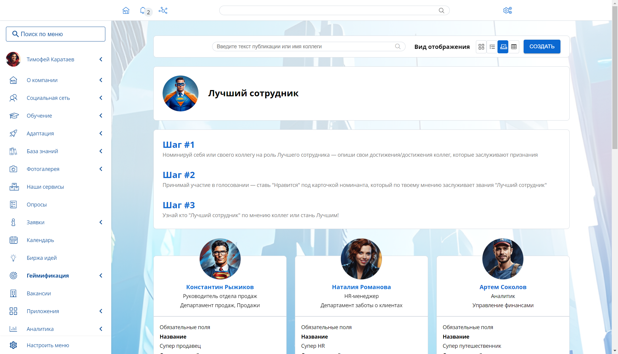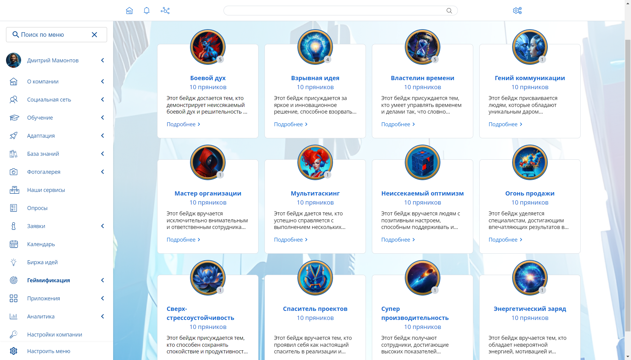 Бейджи. Визуальные награды, с помощью которых формируется доска достижений конкретного сотрудника. Бейджи можно выдавать за участие в различных мероприятиях, за победу в конкурсе на лучшего сотрудника, за участие в субботниках и т. д. Бейджи будут отображаться в профиле сотрудника на портале и визуализировать его успехи, повышая лояльность.