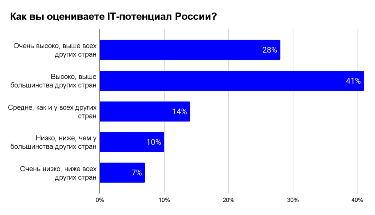 Только 14% респондентов считают, что ИТ-потенциал России не отличается ничем выдающимся, еще 17% оценивают его как низкий и очень низкий.