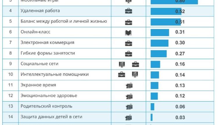 В глобальной повестке FamilyTech (Рис. 1) наиболее значимы тренды поиска баланса между работой (или учебой) и личной жизнью (№ 5 в рейтинге), а также поддерживающими его гибкими формами занятости (№ 8), технологиями дистанционного обучения (№ 2) и шире — EdTech.