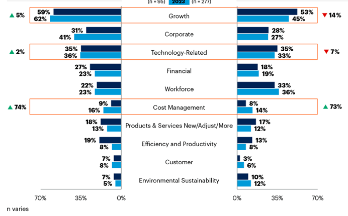 Как показал опрос Gartner, рост бизнеса остается главным стратегическим приоритетом и для финансовых директоров, и для руководителей компаний: 45% опрошенных CEO назвали рост в числе своих трех главных стратегических приоритетов в 2023 году против 53% год назад; среди финансовых директоров о том же сообщили 62% против 59% в прошлом году. В опросе, проведенном в декабре 2022 года, приняли участие 422 действующих CEO, финдиректоров и других руководителей высшего звена.