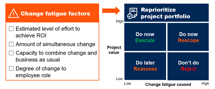 Gartner рекомендует принять в расчет несколько факторов, ведущих к усталости от перемен, взвесив их с учётом значимости проектов, и пересмотреть приоритеты портфеля, чтобы снизить указанные риски (см. рис. 1).