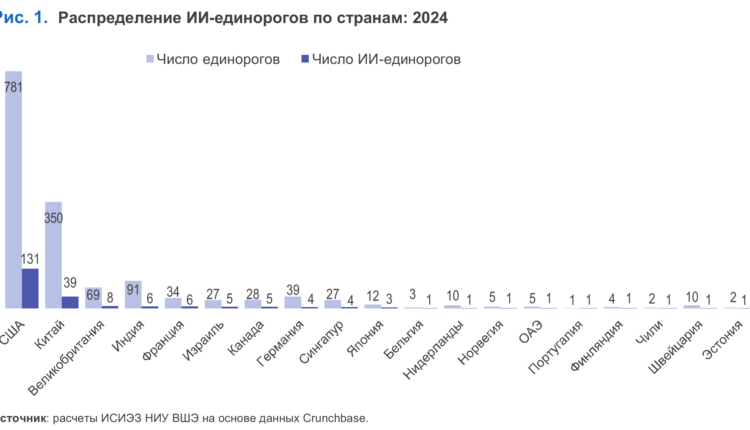 Рис. 1. Распределение ИИ-единорогов по странам: 2024. Источник ИСИЭЗ НИУ ВШЭ
