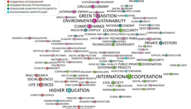 В третьем квартале 2023 года иерархия приоритетов научно-технической политики в мире, наблюдавшихся в первом полугодии, претерпела некоторые изменения, преимущественно под влиянием внешних факторов. Обращает на себя внимание возросшая близость тематик друг к другу на семантической карте (рис. 1), что свидетельствует об их усилившейся взаимосвязи — присутствии в одних и тех же либо содержательно близких документах.