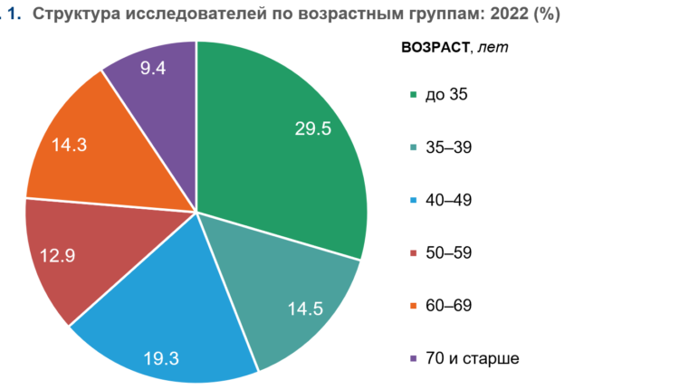 Наиболее многочисленная группа — молодые исследователи до 35 лет1 (100,6 тыс. чел. в 2022 г., или 29,5% общей численности), на привлечение и закрепление которых в науке был направлен целый комплекс мер государственной поддержки.