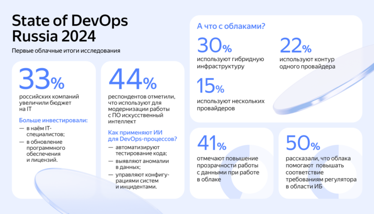 По данным исследования State of DevOps Russia, в 2023 году 33% российских компаний увеличили ИТ-бюджет. Больше всего бизнес инвестировал в найм ИТ-специалистов и обновление программного обеспечения и лицензий. Для оптимизации работы ПО и DevOps-процессов компании стали чаще применять технологии искусственного интеллекта — об этом рассказали 44% опрошенных.