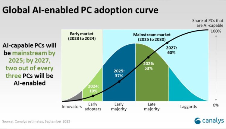 Персональные системы с развитыми аппаратными возможностями для локального запуска генеративных моделей искусственного интеллекта — в современных терминах это настольные и мобильные рабочие станции с солидными графическими процессорами и/или специализированными нейропроцессорами для ускоренной обработки ИИ-задач — рассматриваются в Canalys как магистральный тренд для всего сегмента ПК. Аналитики полагают, что уже по итогам 2024 г. доля таких систем в общем объёме мировых поставок персональных компьютеров достигнет 19%, а к 2027-му вырастет до 60% (см. прилагаемый график).