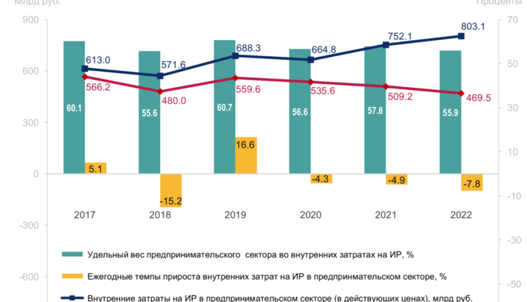 Предпринимательский сектор вносит существенный вклад в развитие ИР как их исполнитель: в России он выполняет более половины (55,9% в 2022 г.) общего объема внутренних затрат на ИР, или 803,1 млрд руб. в действующих ценах. В странах — членах ОЭСР на его долю (как исполнителя ИР) приходится в среднем 73% общего объема внутренних затрат на ИР (например, в США — 77,6%, Японии — 78,6%, Республике Корея — 79,1%, Франции — 65,7%, Италии — 60,2%), в среднем по странам ЕС-27 — 65,6%, Китае — 76,9%, Тайване — 84,3%.