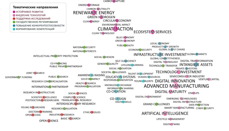 Меры политики ведущих стран по достижению технологического суверенитета образуют два близких кластера тематик — связанных с ускоренным внедрением конкретных групп технологий, преимущественно цифровых