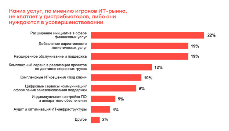 Рис. 1. Каких услуг, по мнению игроков ИТ-рынка, не хватает у дистрибьюторов, либо они нуждаются в усовершенствовании