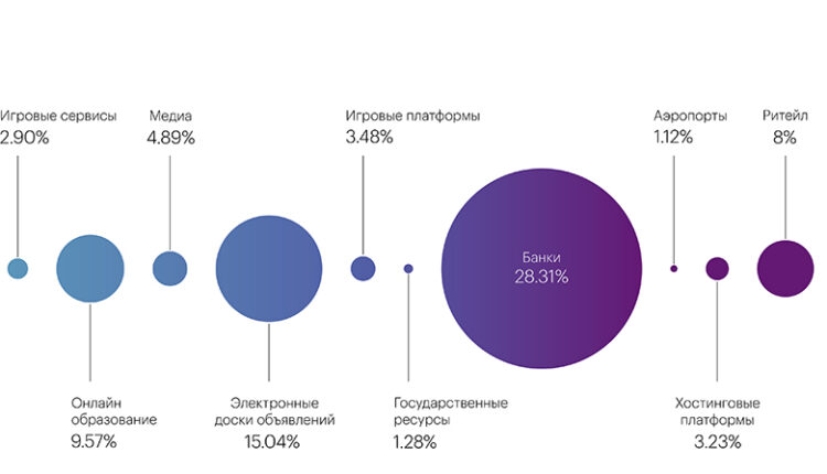 На уровне микросегментов основной целью злоумышленников были Банки — 28,31%, которые традиционно подвергались атакам в периоды активного продвижения сезонных банковских продуктов — кредитов и вкладов. В ТОП 5 также вошли Электронные доски объявлений — 15,04%, Образовательные платформы — 9,57%, Онлайн-магазины — 8% и Платежные системы — 7,05%. (рис. 1)