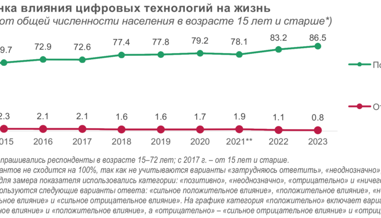 Рис. 1. Оценка влияния цифровых технологий на жизнь (в % от общей численности населения в возрасте 15 лет и старше* )Источник: ИСИЭЗ НИУ ВШЭ