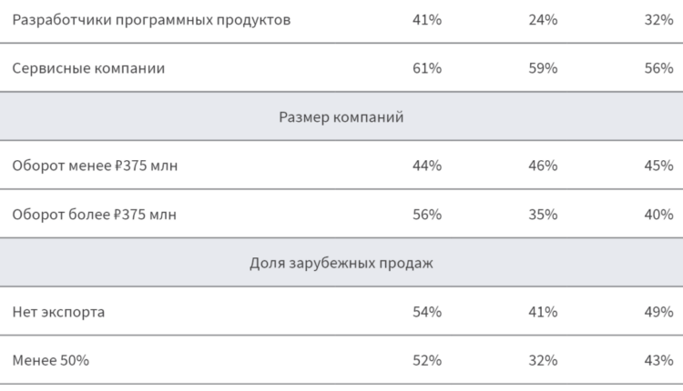 В 2022 г. произошло явное сокращение доли удаленного режима работы. При этом возвращение в офисы части сотрудников произошло почти во всех категориях компаний, но неравномерно. Наибольшее сокращение «удаленки» произошло в тех компаниях, которые разрабатывают программные продукты, имеют оборот менее ₽375 млн., долю экспорта менее 50% и которые расположены за пределами Москвы и Петербурга.