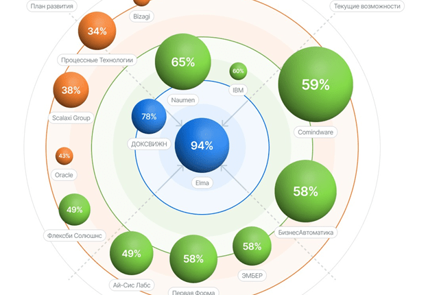 По результатам исследования были названы лидеры с итоговым баллом выше 70 — компании Elma и «Доксвижн». Эти поставщики обладают комплексной функциональностью, готовы к развертыванию своих решений в гибридной инфраструктуре. Компании практикуют «продуктовый подход», т. е. сосредоточены на разработке тиражируемых решений по управлению бизнес-процессами.