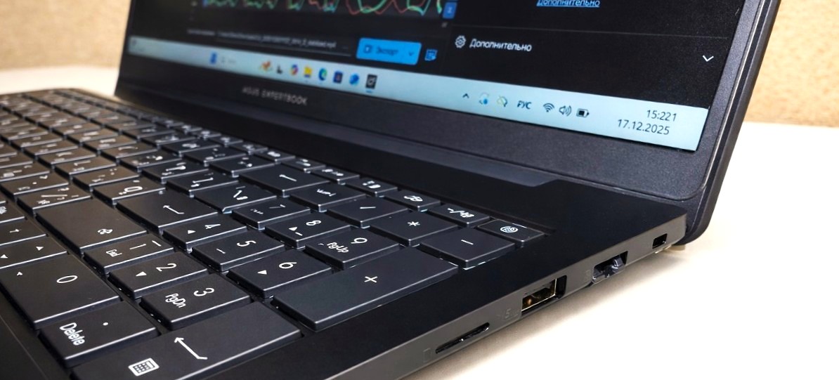 К слову, ExpertBook B5 прошел сертификацию по военному стандарту MIL-STD 810H. Конечно, это не значит, что им можно забивать гвозди, но тряску в багаже, перепады температур и случайные удары он переживет увереннее, чем обычный потребительский ультрабук. Клавиатура имеет защиту от влаги (выдерживает до 78 мл жидкости) и оснащена отдельным цифровым блоком, чего часто лишены мобильные ПК. Ход клавиш глубокий и четкий, а тачпад не «проседает» при использовании.