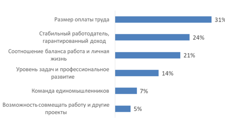 Для 31% опрошенных Ventra ИТ-специалистов важнее всего оплата труда, 24% важны стабильный работодатель и гарантированный доход, 21% выбрали фактор соотношения баланса работы и личной жизни, для 14% важны уровень задач и профессиональное развитие, 7% ценят команду единомышленников, 5% важно совмещать работу и другие проекты.