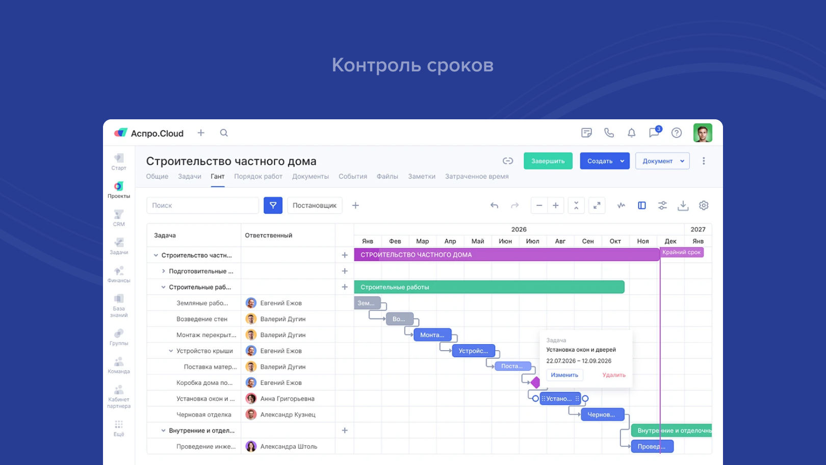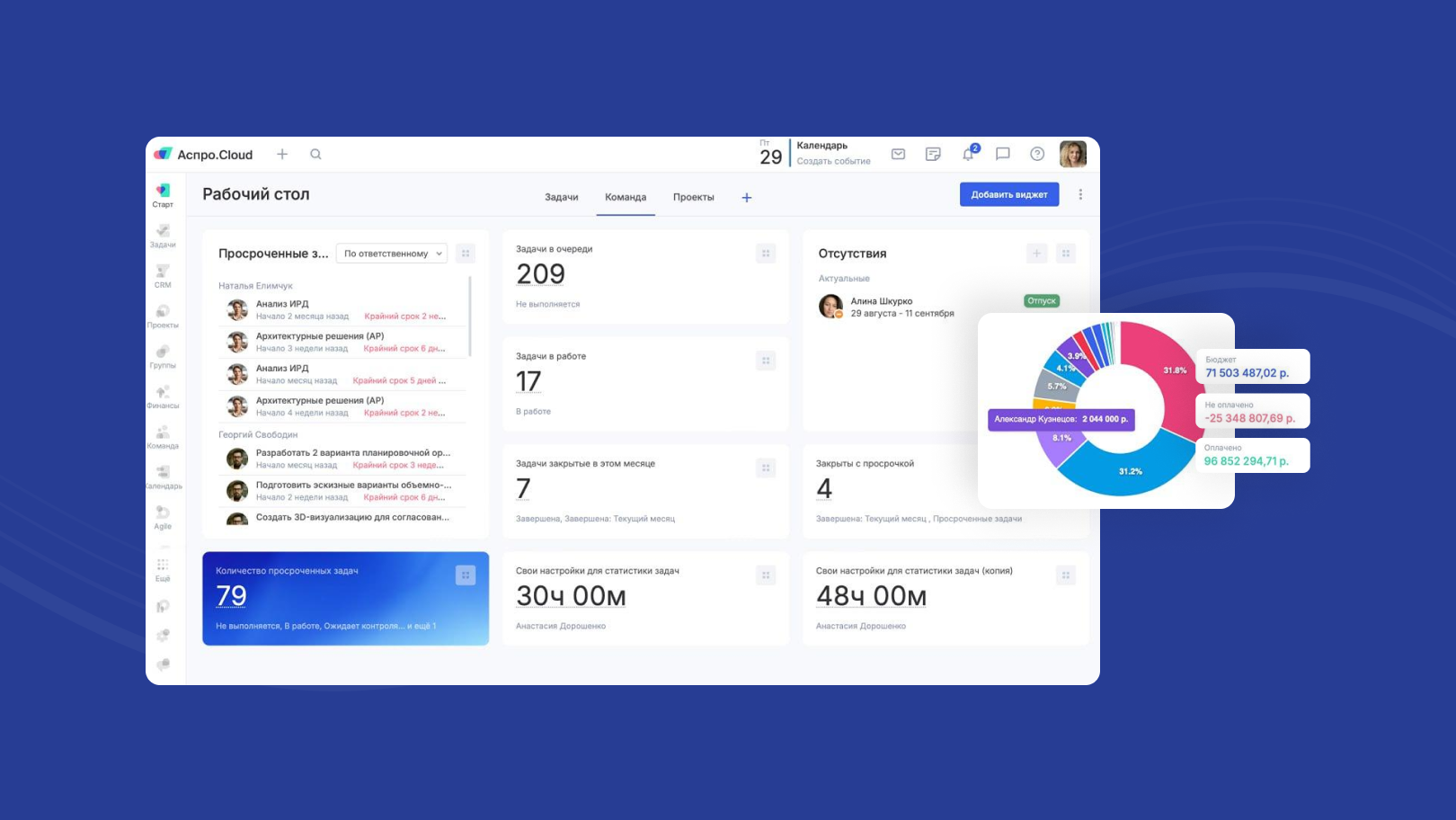 Аспро Cloud отвечает этим вызовам. Платформа позволяет в едином контуре контролировать как сроки (WBS, диаграммы Ганта, алерты по дедлайнам), так и бюджеты (лимиты по статьям, CPI, маржинальность). Благодаря этому инструмент востребован в агентствах, интеграторах, девелоперских и консалтинговых компаниях.