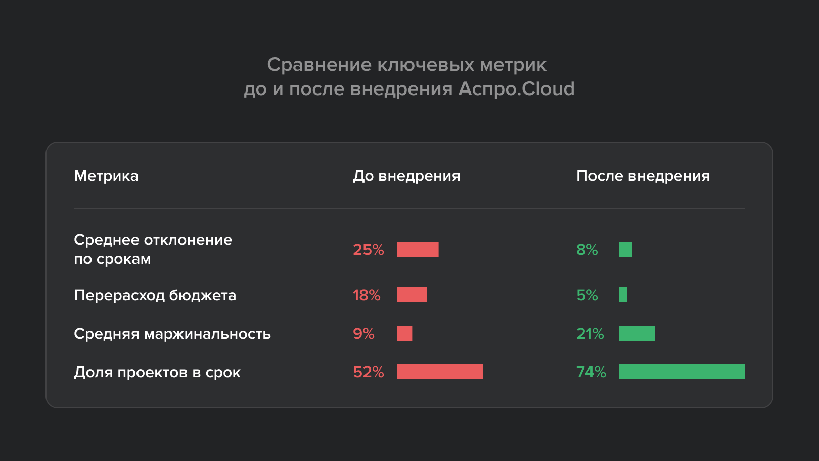 Чтобы показать эффект внедрения план-факта, рассмотрим кейс интеграционной компании, которая запустила Аспро.Cloud в 2024 году. До внедрения руководители жаловались на затяжные старты, отсутствие прозрачности по бюджету и регулярные просрочки. Уже через полгода после запуска системы результаты изменились кардинально.